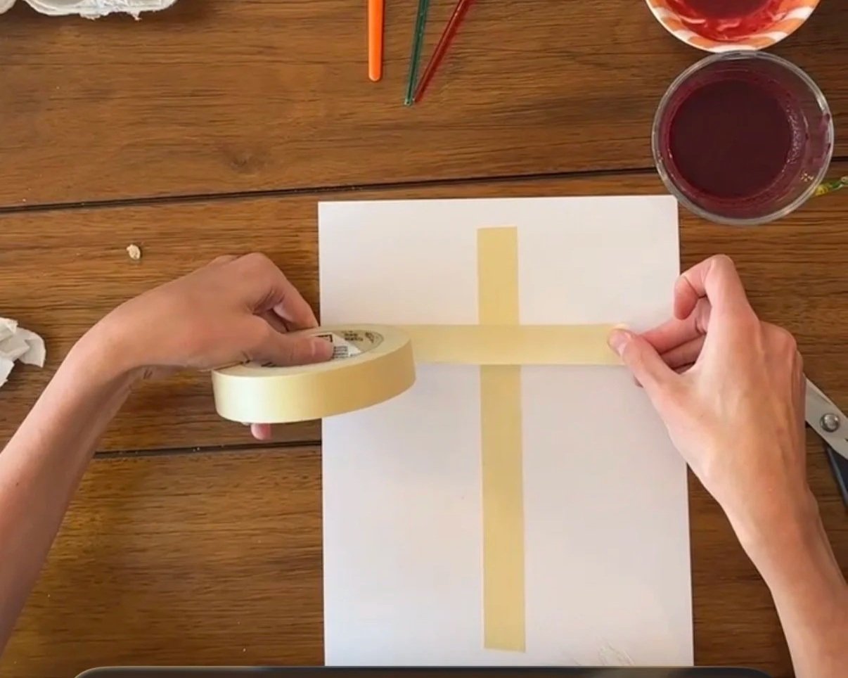 I started by using masking tape to tape a cross-shape onto the cardstock paper, keeping the cross taped on the entire time she painted.