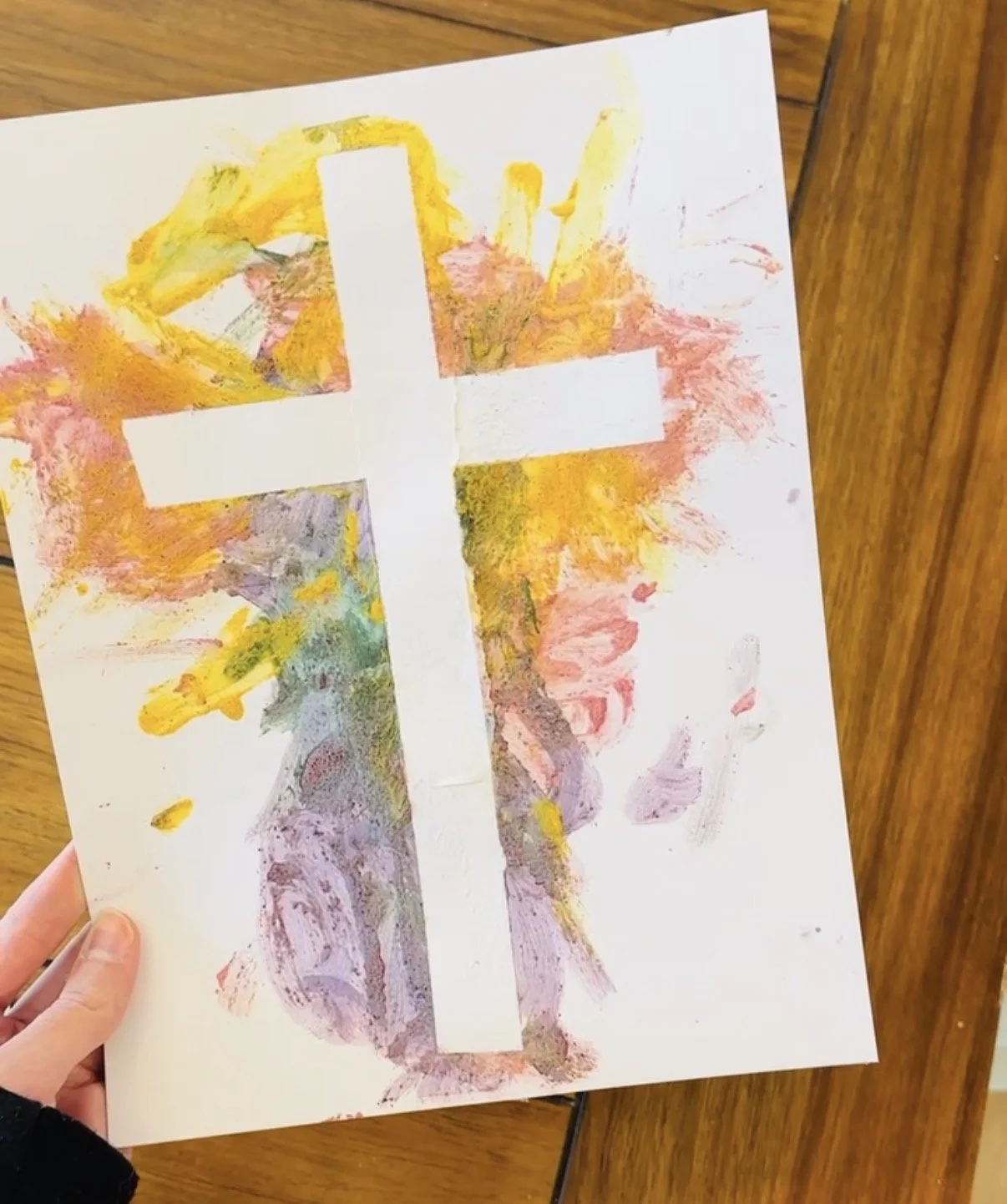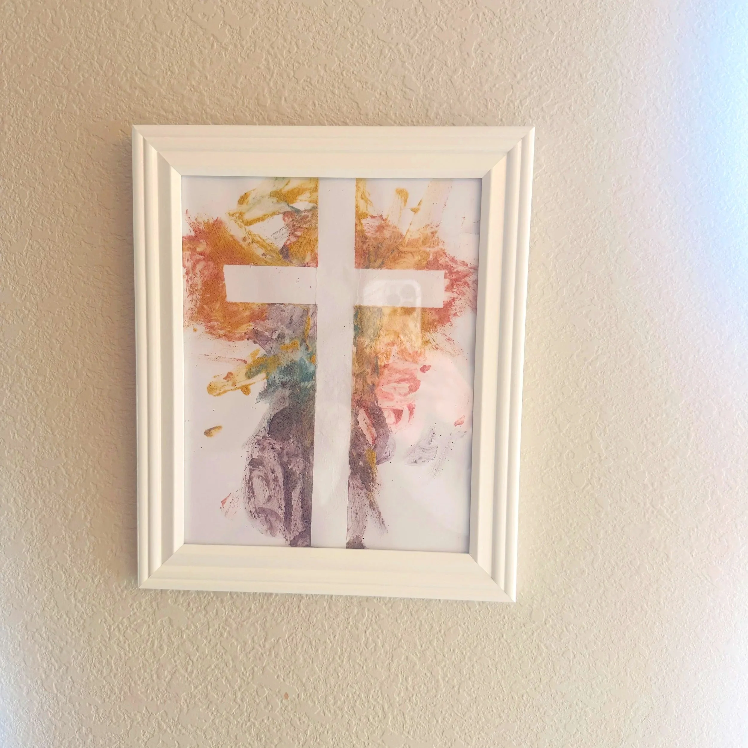 After the paint dried, I removed the tape and the white cross appeared, surrounded by the splotches of color.