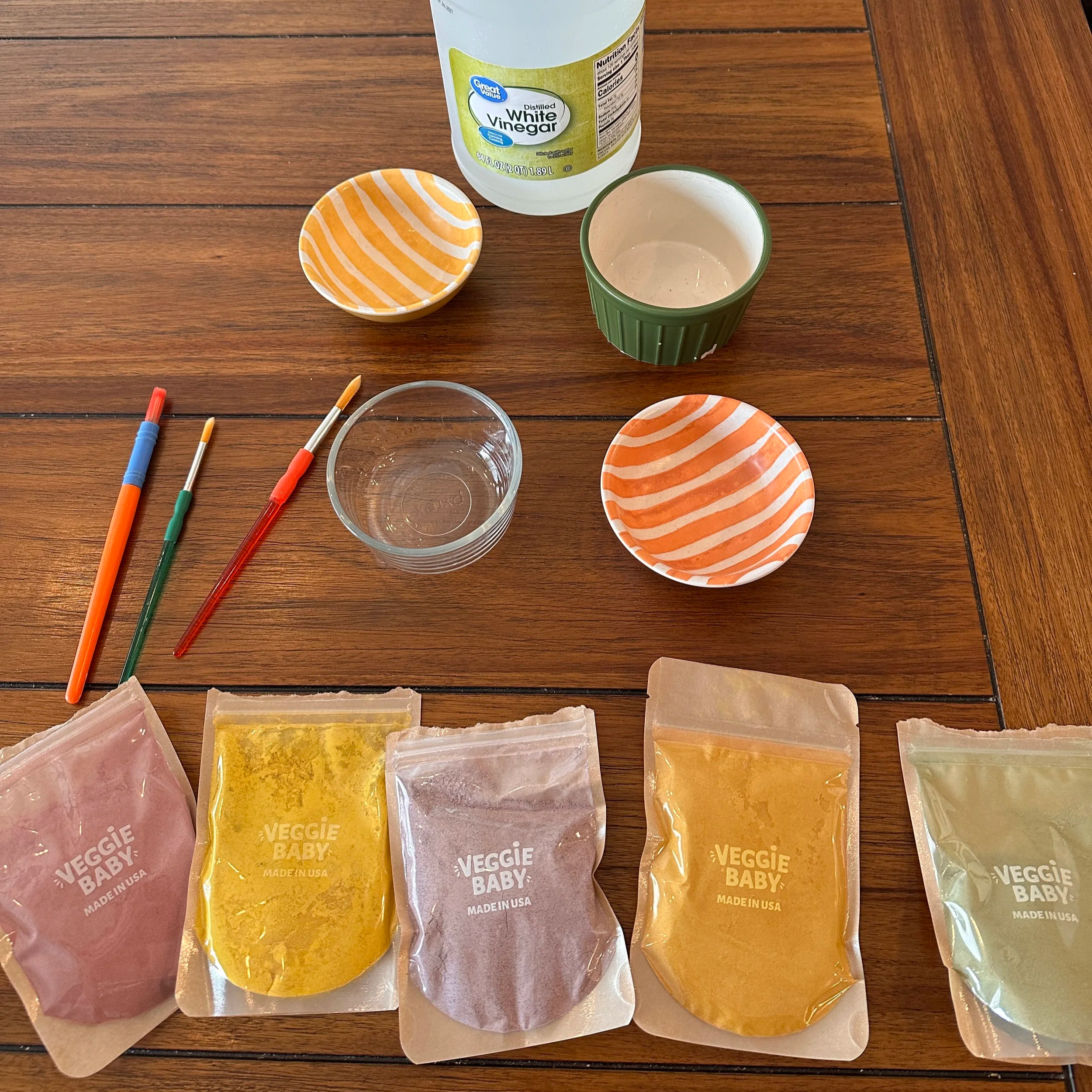 I prepared some non-toxic edible veggie paints ahead of time (I used VeggieBaby off of Amazon ). They have natural and vibrant colors, perfect for the Easter season.