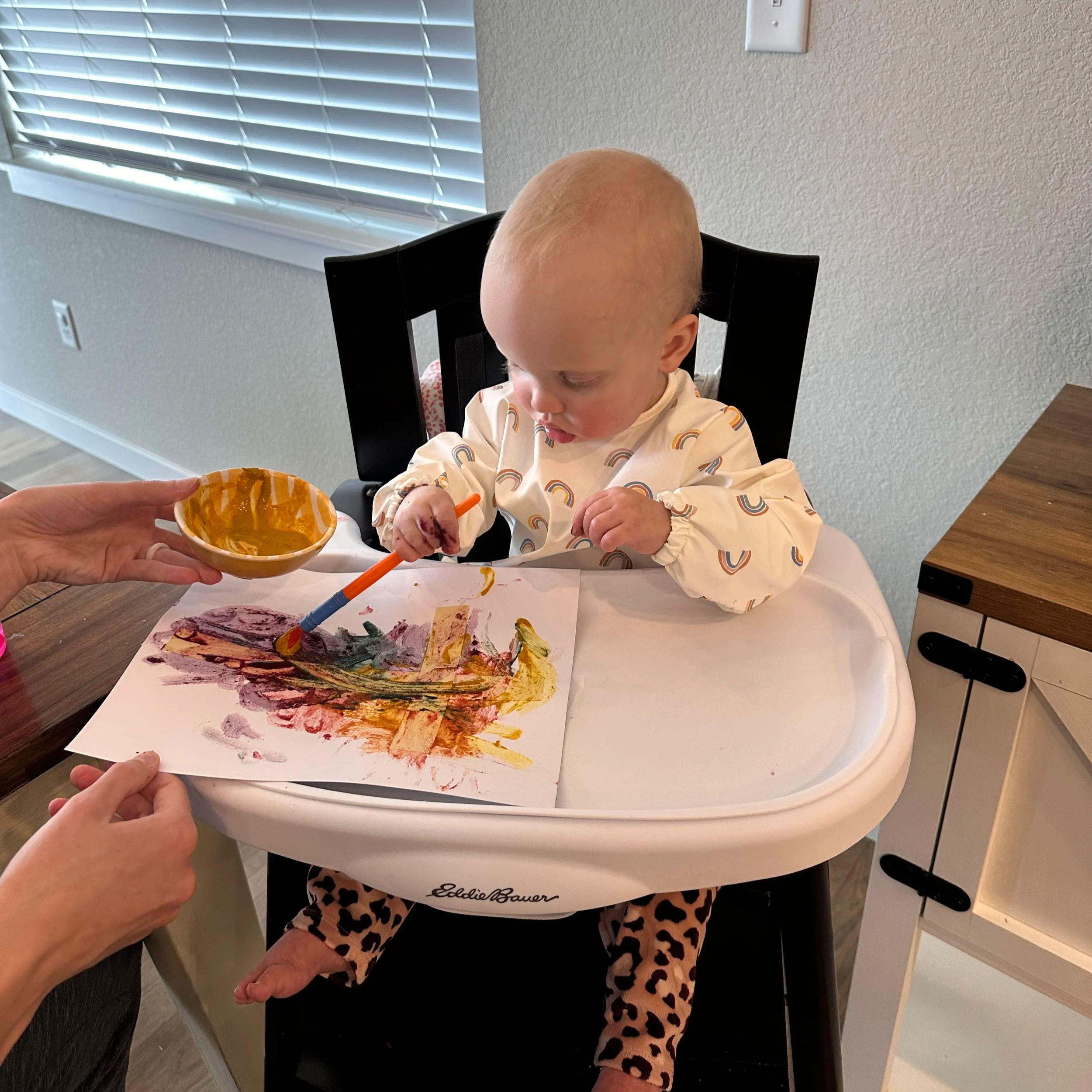 Pro-tip: I took off her shirt and put a long-sleeve bib on for easy clean up; I also kept her in the high chair and put an unfolded trash baggie underneath it.